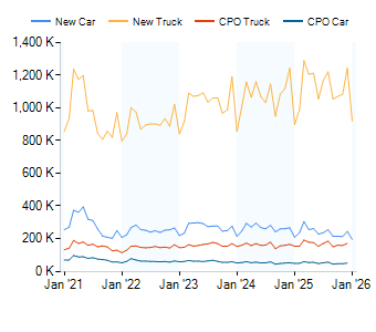 January 2026 New Vehicle Unit Sales, SAAR, CPO Sales, Inventory and Incentives Spending results are now available for query.